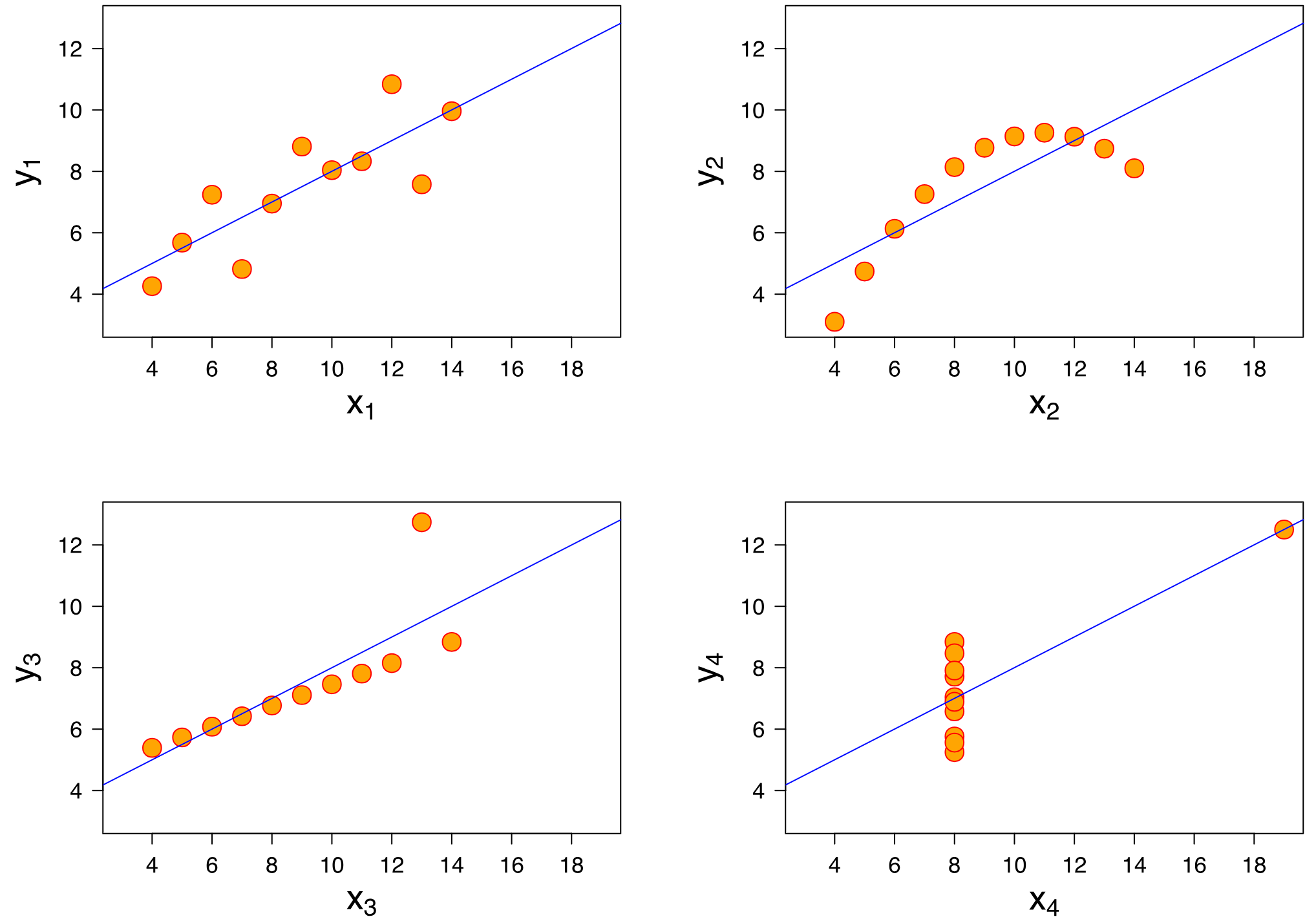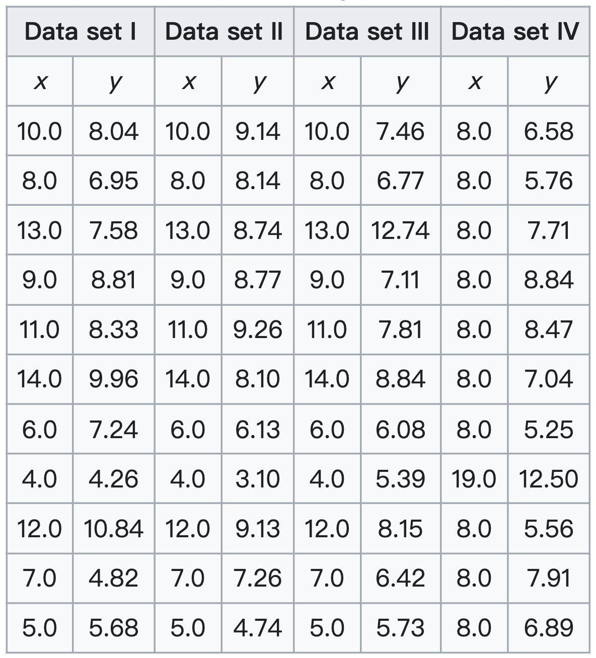 Human beings are visual animals, we are not good at directly digesting the patterns in a table. The following graph allows us to easily understand this concept. These data sets are originally from Anscombe’s quartet in 1973.
