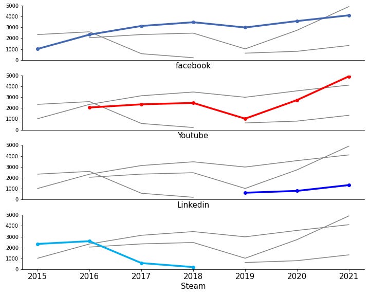 In Graph 5, we have kept the trend from Graph 4. Each subplot has data from a different category. The grey lines give a background for other categories. They let viewers compare data by year and category. Also, the X-axis only needs to be at the bottom chart because we are good at comparing things vertically. To make the visualization even better, we could dim the background grey lines even more and annotate specific numbers on key data points (in this case, fade or delete the y-axis at the same time.).